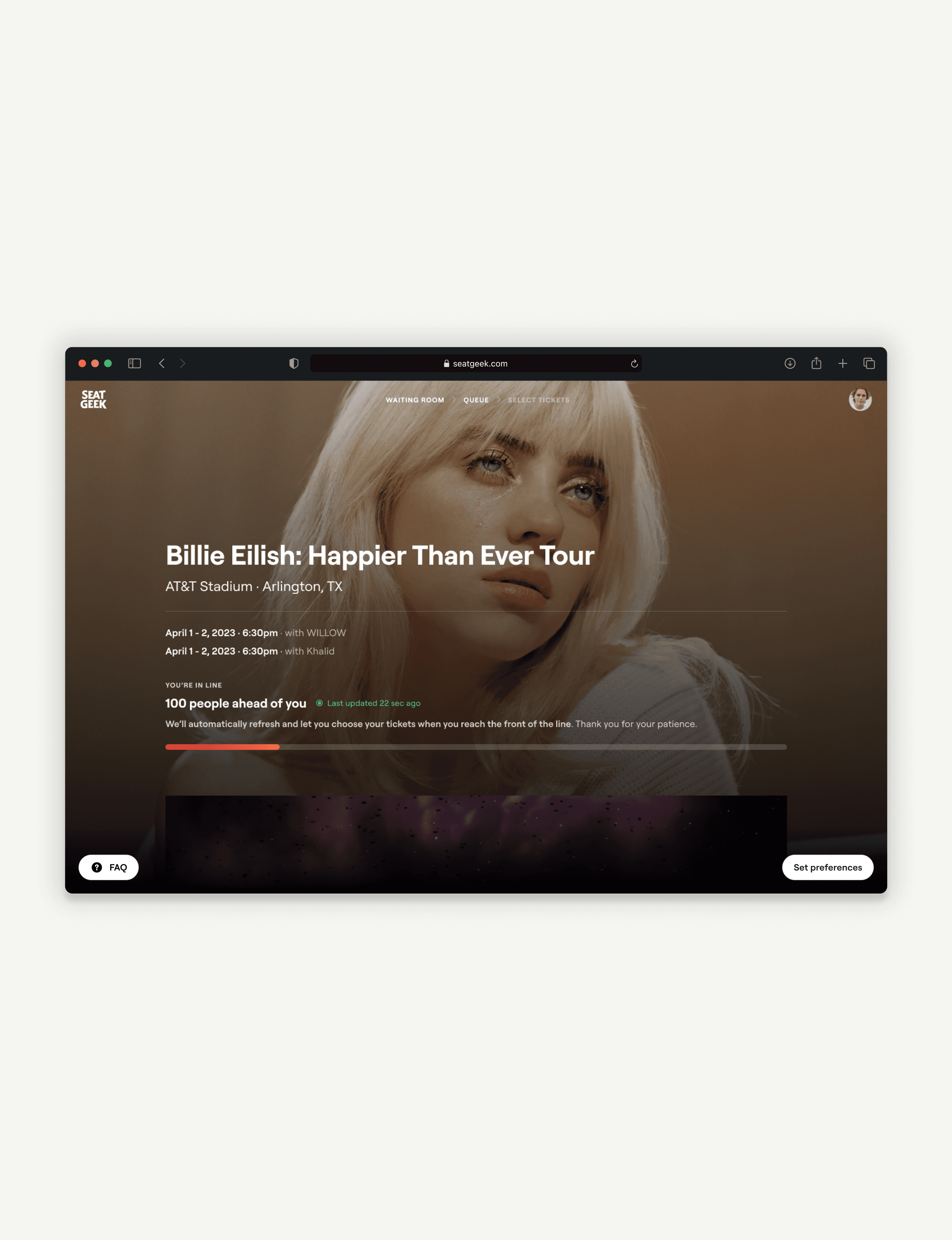 Redesigned SeatGeek’s virtual waiting room to improve clarity, reduce checkout time, and increase customer satisfaction. Introduced in-queue ticket preference selection, with early design exploration contributing to +3% increase in checkout conversion.